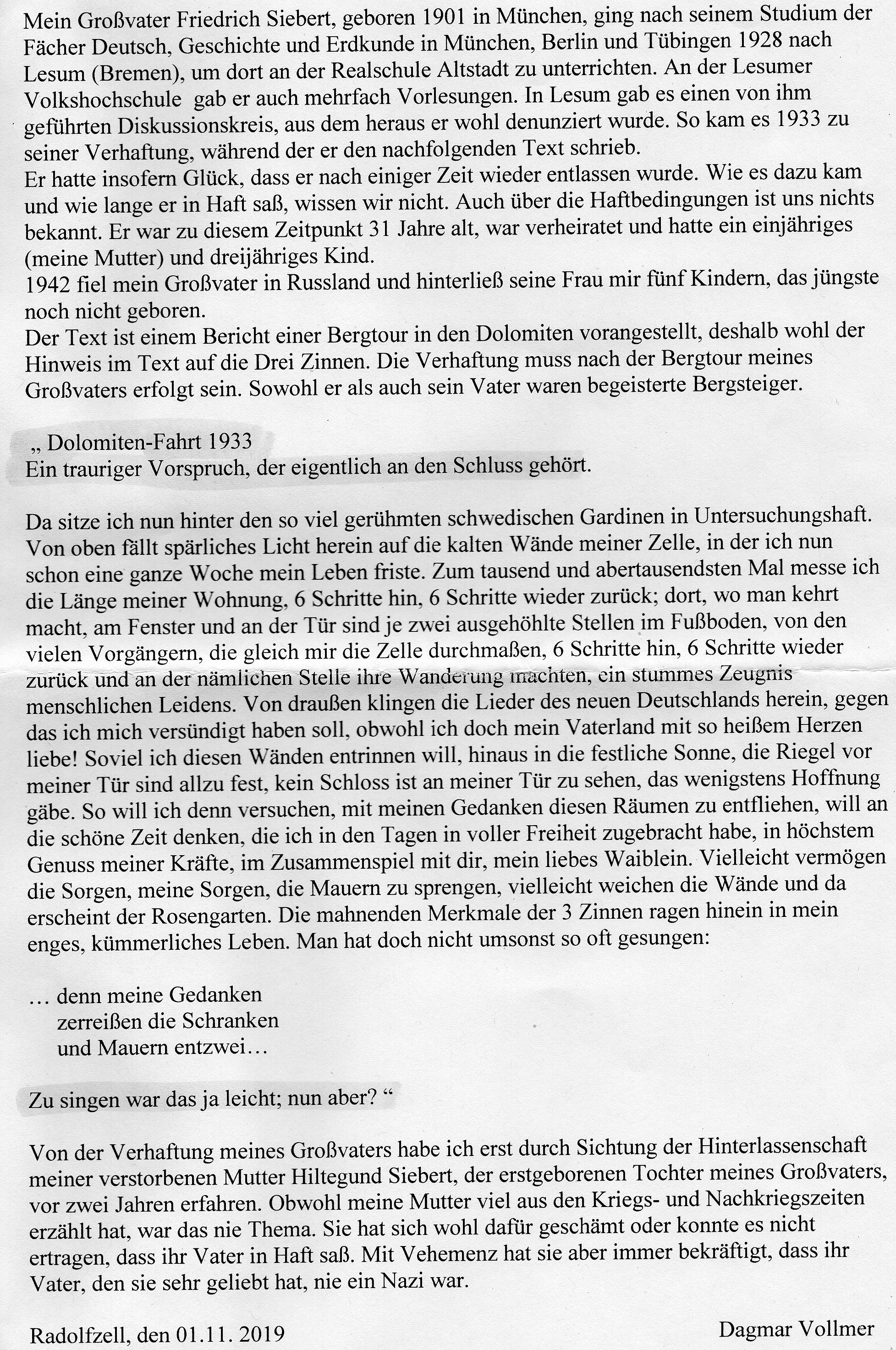 Der vollständige Text von F.Siebert steht oben in Sütterlinschrift mit Übersetzung von Dagmar Vollmer in der Bildergalerie ↑