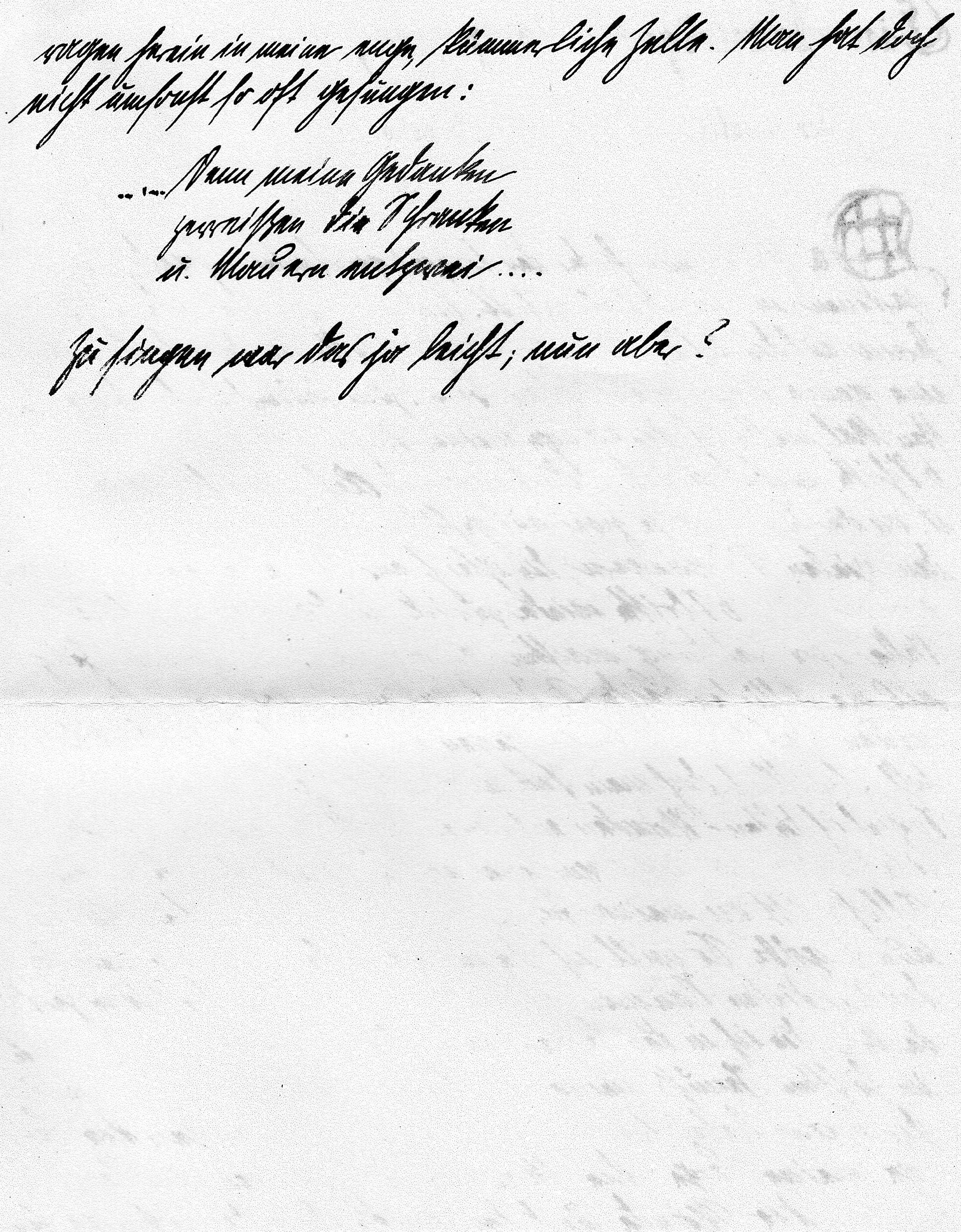 ... Soviel ich diesen Wänden entrinnen will, hinaus in die festliche Sonne, die Riegel vor meiner Tür sind allzu fest, kein Schloss ist an meiner Tür zu sehen, das wenigstens Hoffnung gäbe. So will ich denn versuchen,mit meinen Gedanken diesen Räumen zu entfliehen, will an die schöne Zeit denken, die ich in den Tagen voller Freiheit zugebracht habe, in höchstem Genuss meiner Kräfte, im Zusammenspiel mit Dir, mein liebes Waiblein. Vielleicht vermögen die Sorgen, meine Sorgen, die Mauern zu sprengen, veilleicht weichen die Wände und da erscheint der Rosengarten. Die mahnenden Merkmale der Drei Zinnen (Anm.:= Dolomitenberge) ragen hinein in mein enges, kümmerliches Leben. Man hat doch nicht umsonst so oft gesungen: